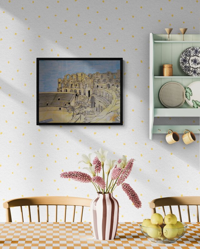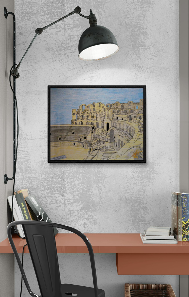 Majestueux et silencieux, l’amphithéâtre d’El Jem surgit du papier dans cette œuvre originale au crayon de bois, capturant l’ampleur d’un patrimoine classé à l’UNESCO. Sur feuille 160 g/m², chaque détail rend hommage à la puissance romaine et à la beauté brute de cette architecture tunisienne.